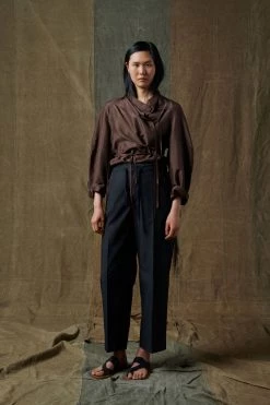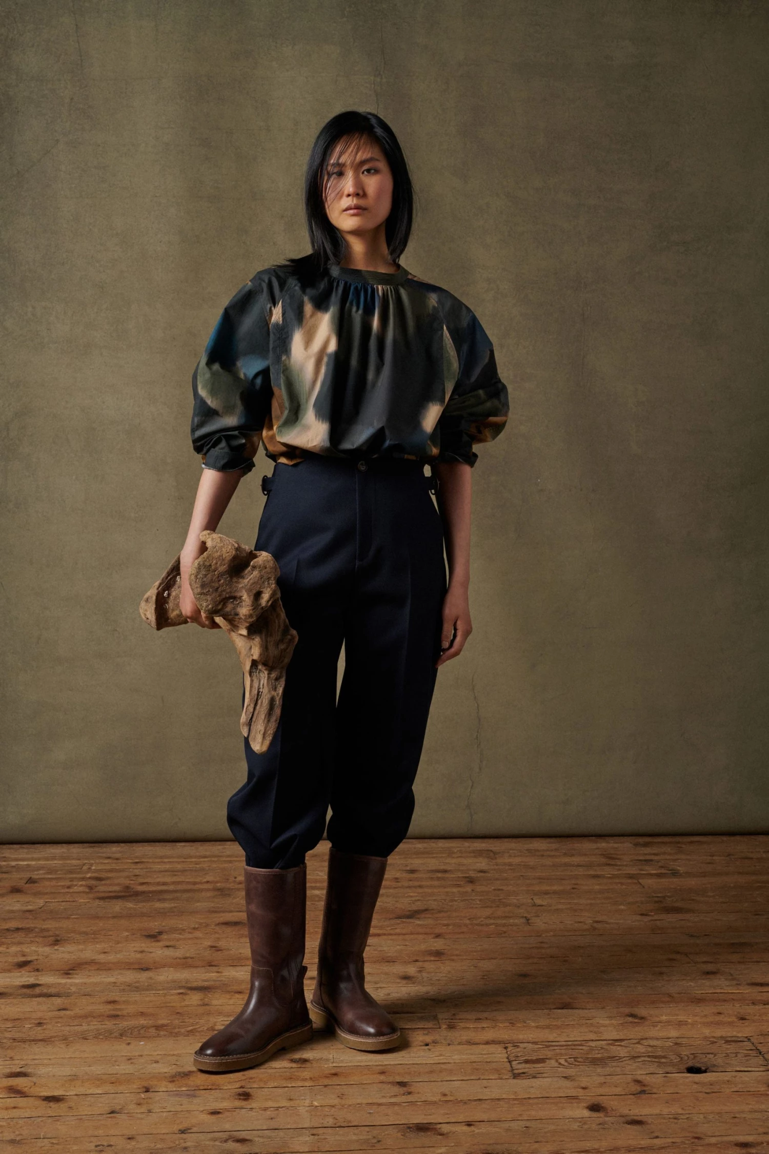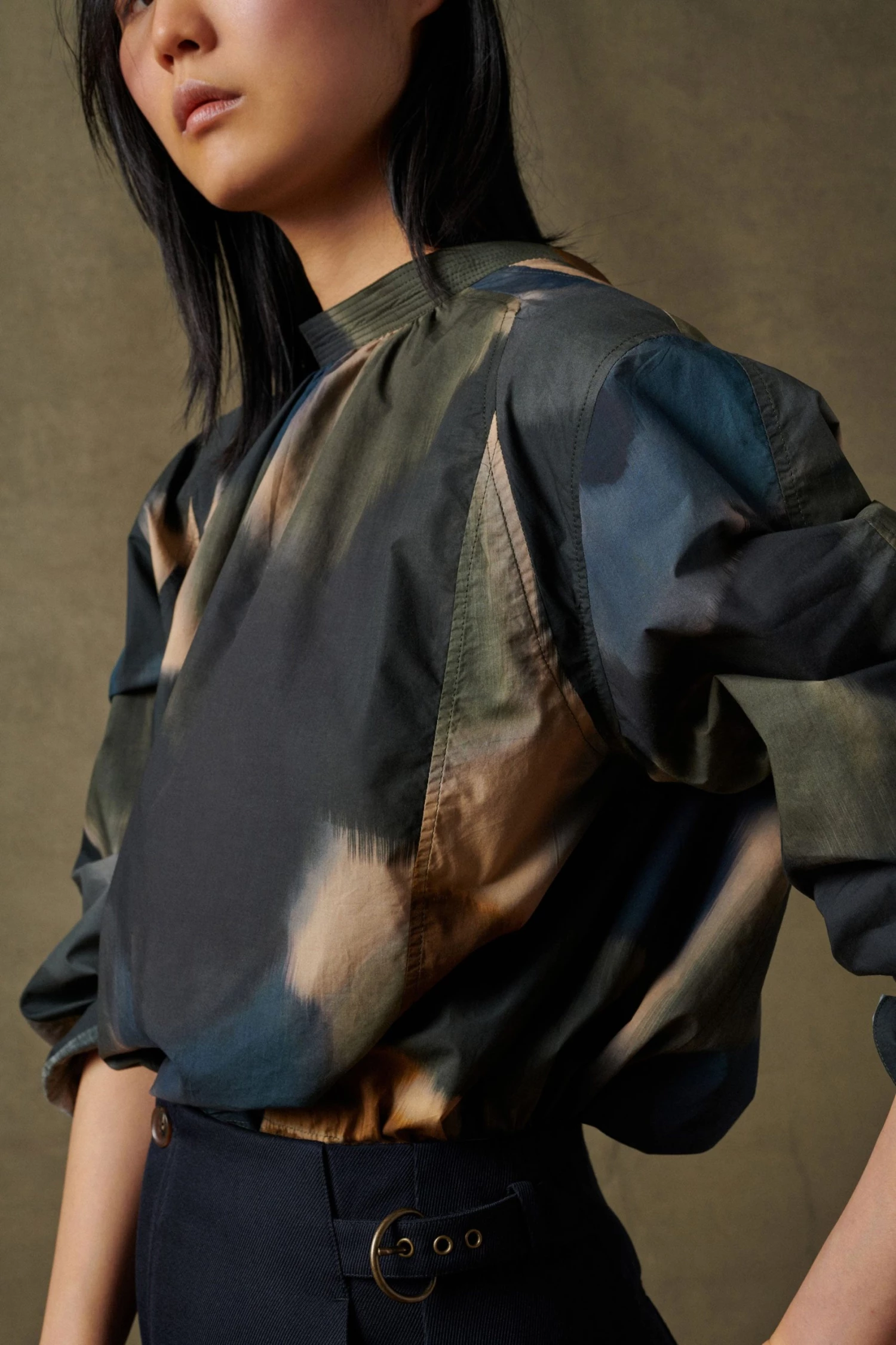 Scarlett est une chemise empruntant les codes de la vareuse avec de nombreuses découpes et empiècements à l’encolure. Le placement des lignes et des détails a été travaillé pour obtenir une forme ample et ronde.