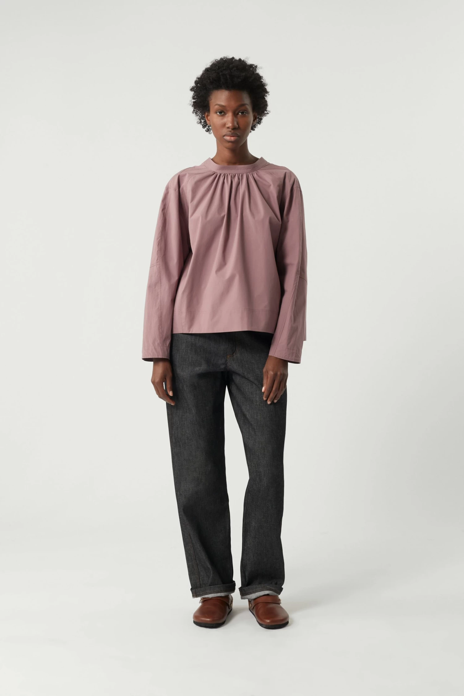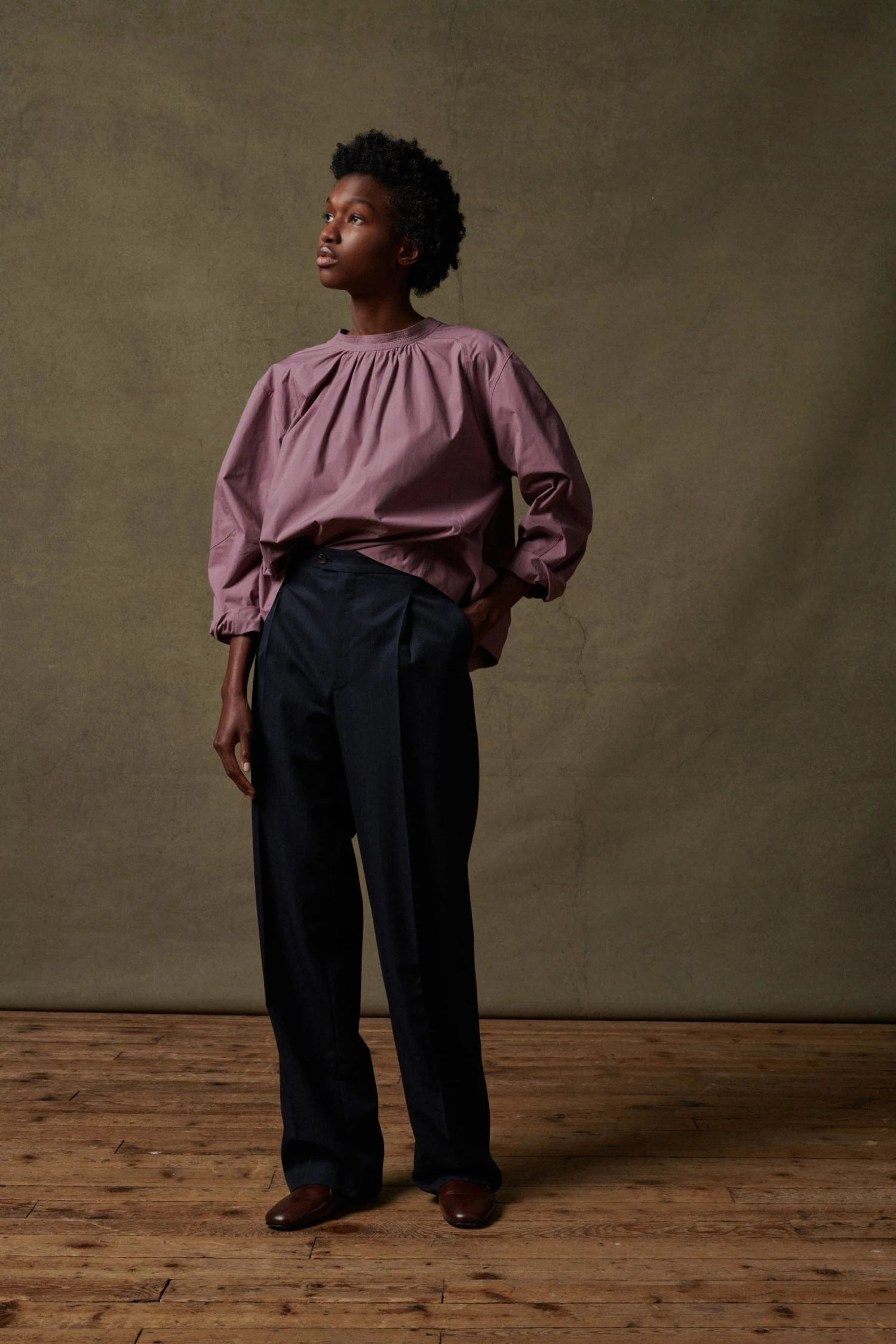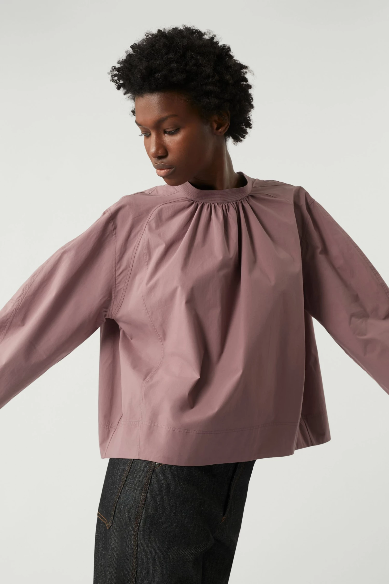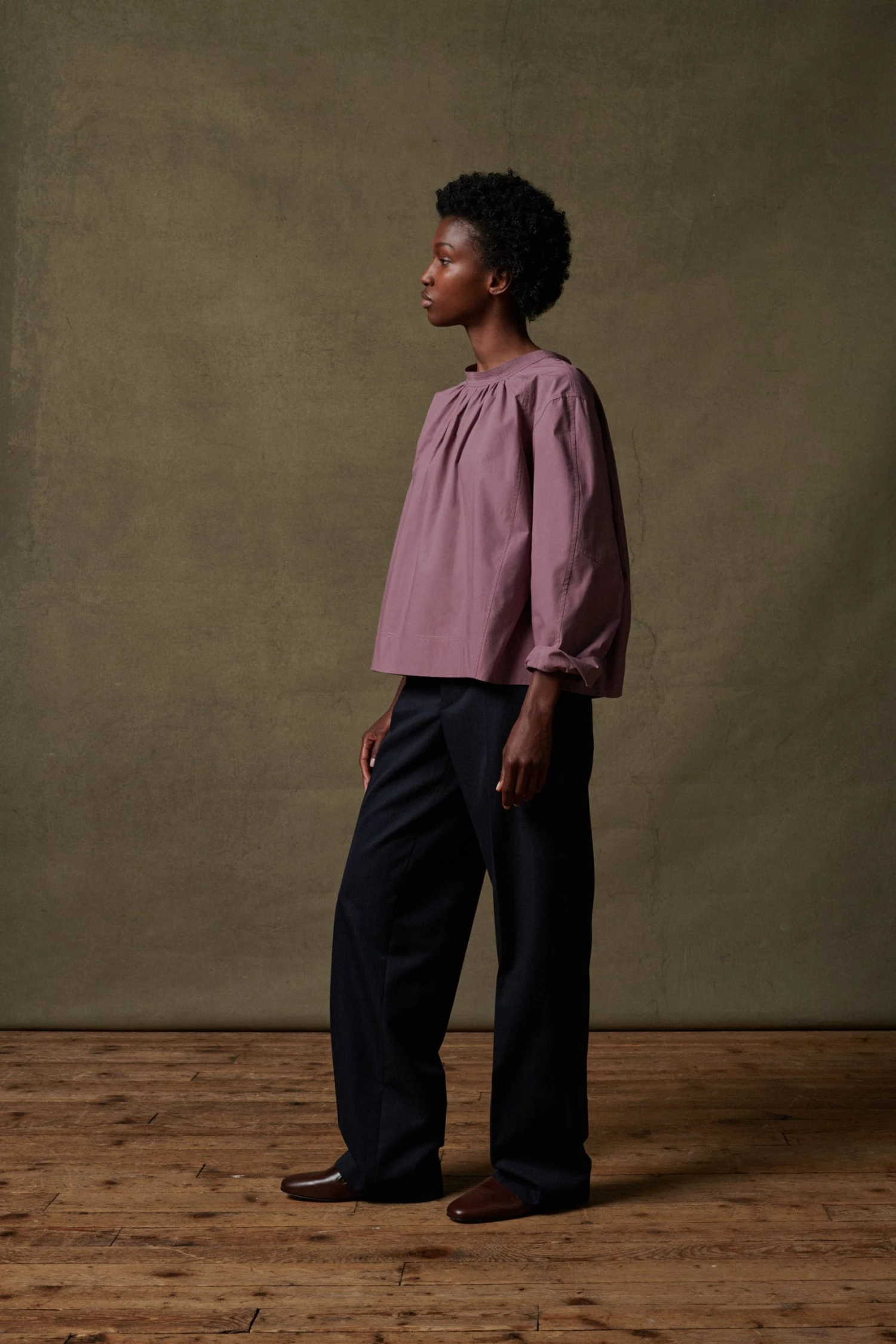Scarlett est une chemise empruntant les codes de la vareuse avec de nombreuses découpes et empiècements à l’encolure. Le placement des lignes et des détails a été travaillé pour obtenir une forme ample et ronde.
