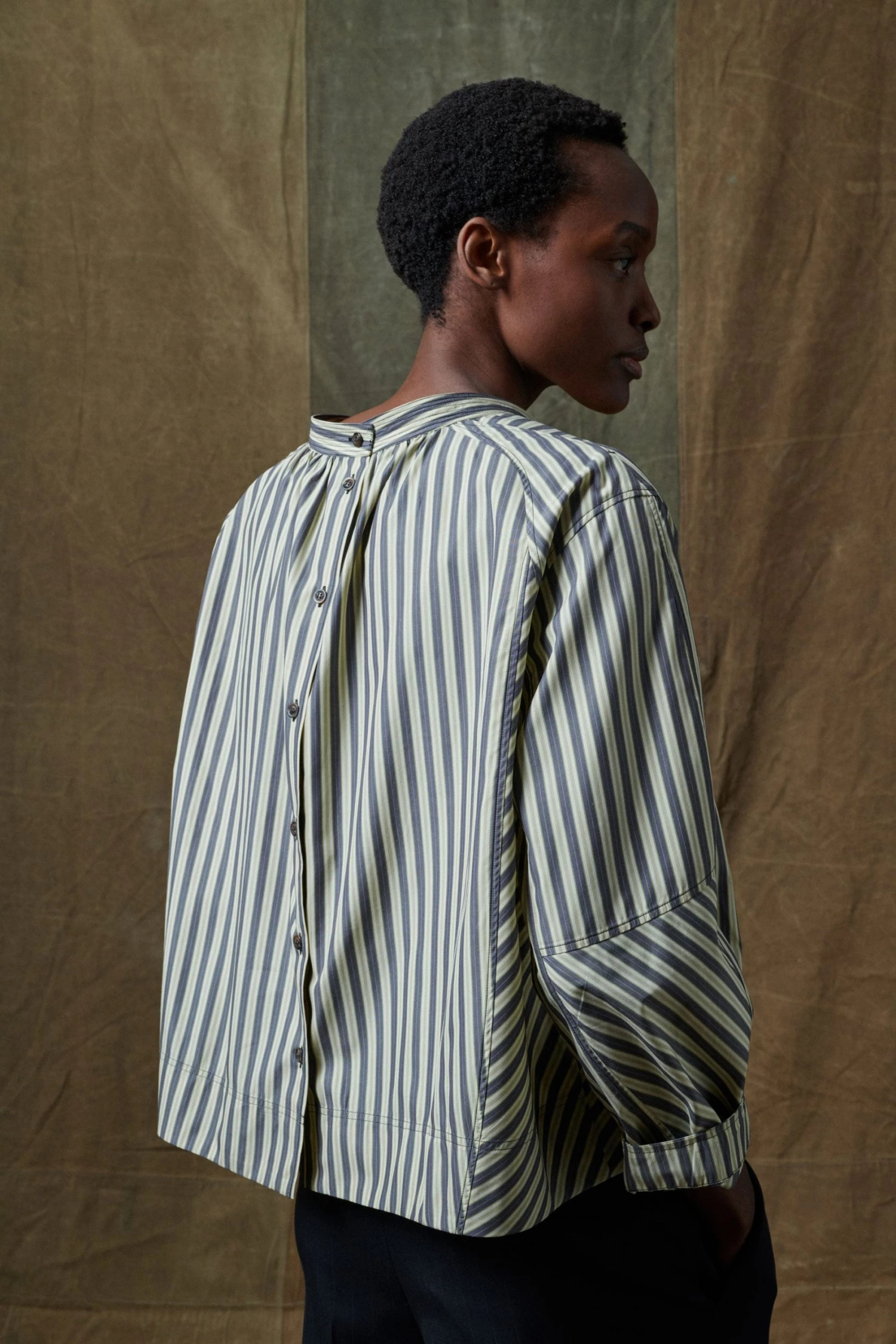 Scarlett est une chemise empruntant les codes de la vareuse avec de nombreuses découpes et empiècements à l’encolure. Le placement des lignes et des détails a été travaillé pour obtenir une forme ample et ronde.