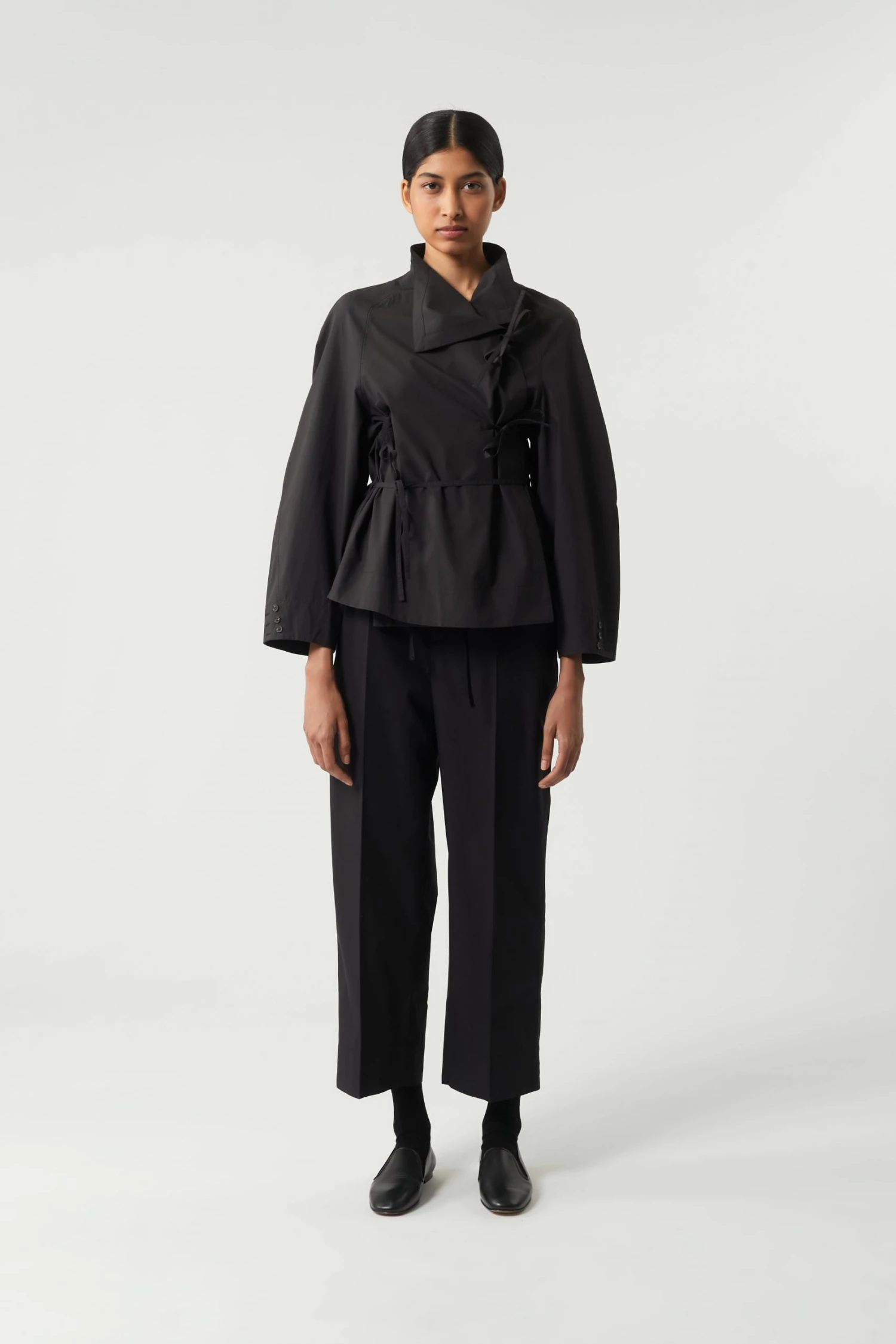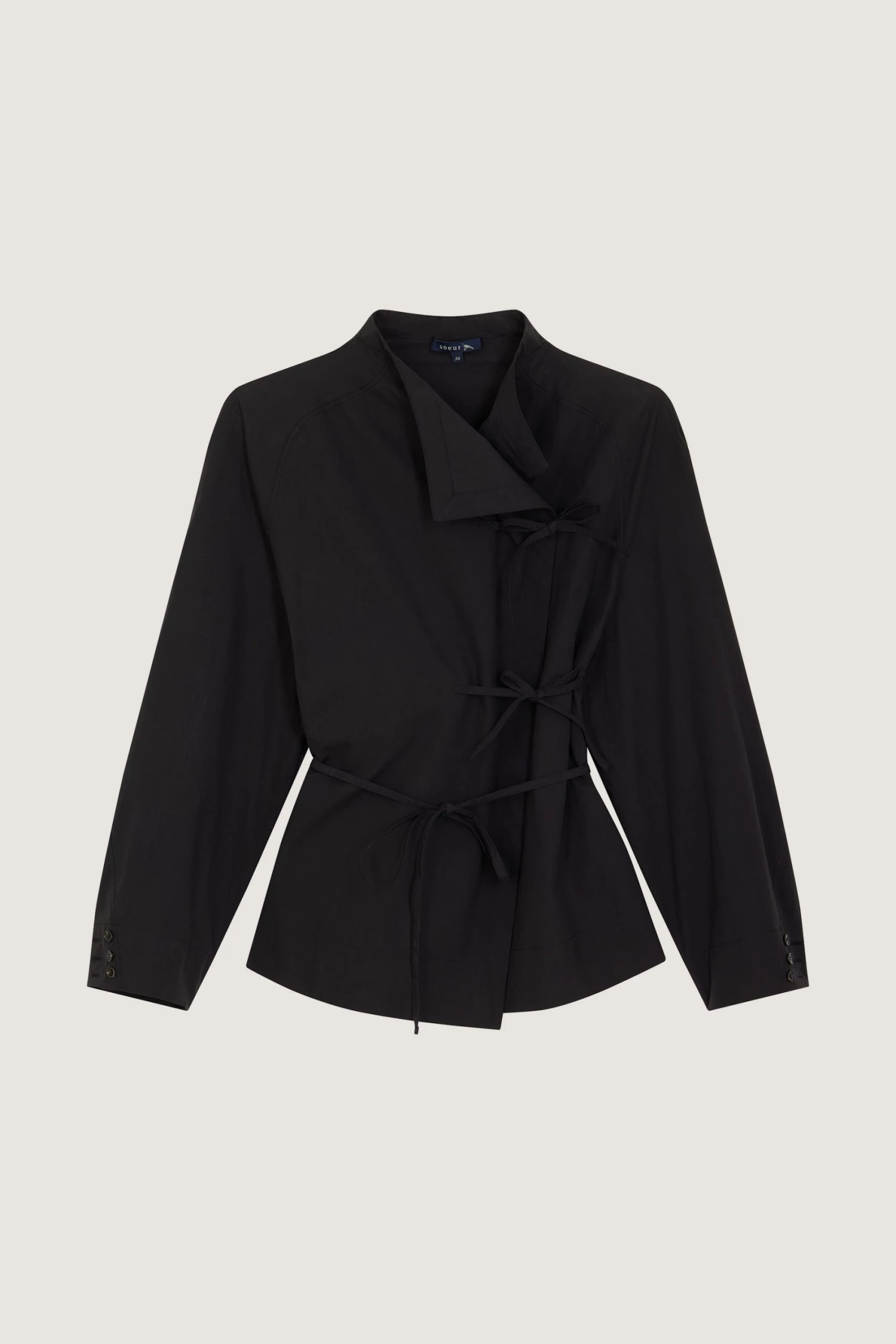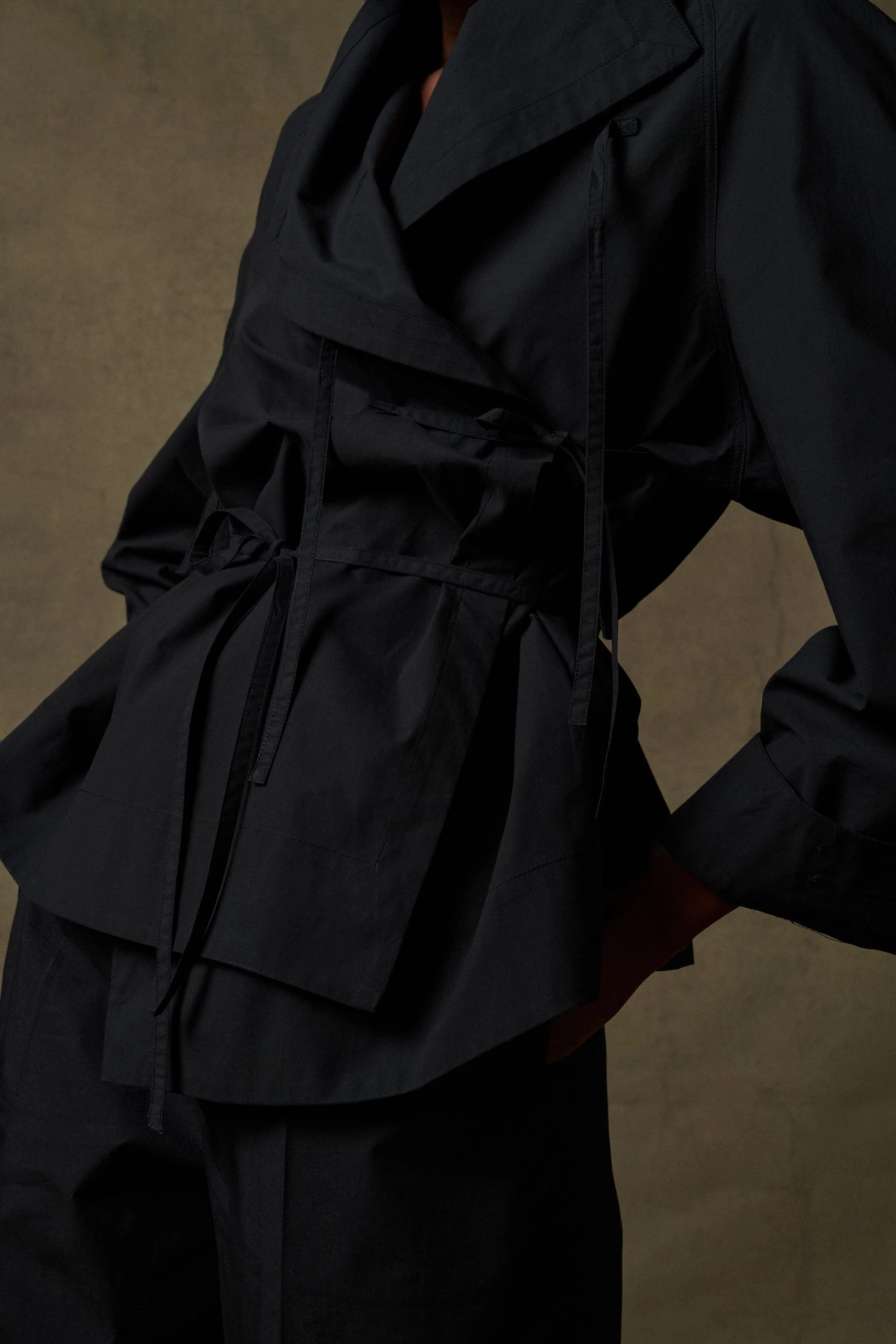 Spring est une blouse à l’allure « couture » et à la construction raffinée. C’est un modèle cache cœur qui se referment jusqu’au col par un jeu de liens à la taille et à la poitrine. Le volume droit est modulable, se nouant et s’adaptant au corps selon les envies.