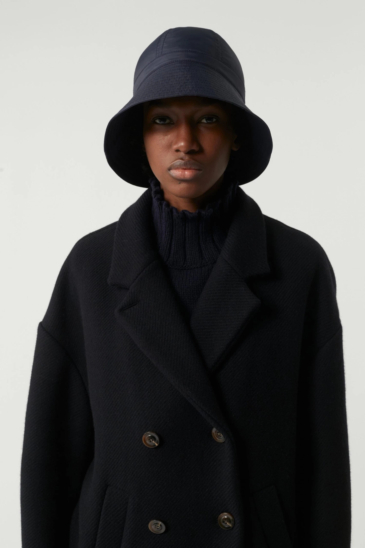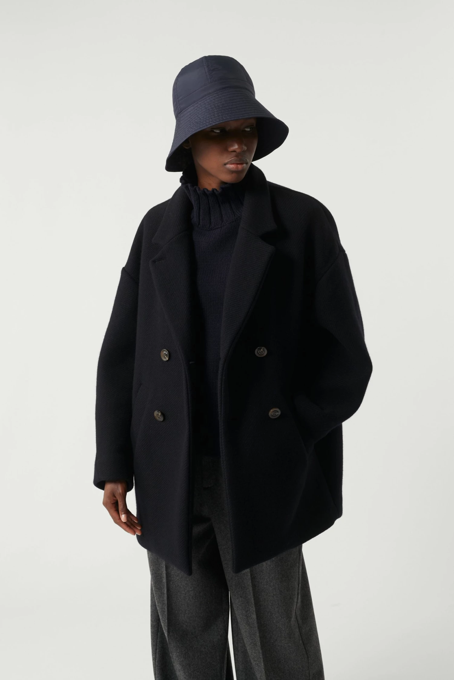 Salford possède un double boutonnage réversible (à fermer à droite ou à gauche) et peut se porter avec le col relevé en attachant le bouton. Les manches ont une couture décalée pour arrondir le volume et le faire revenir vers l’avant. Celles-ci se terminent par des boutons afin d’ajuster la largeur du poignet.