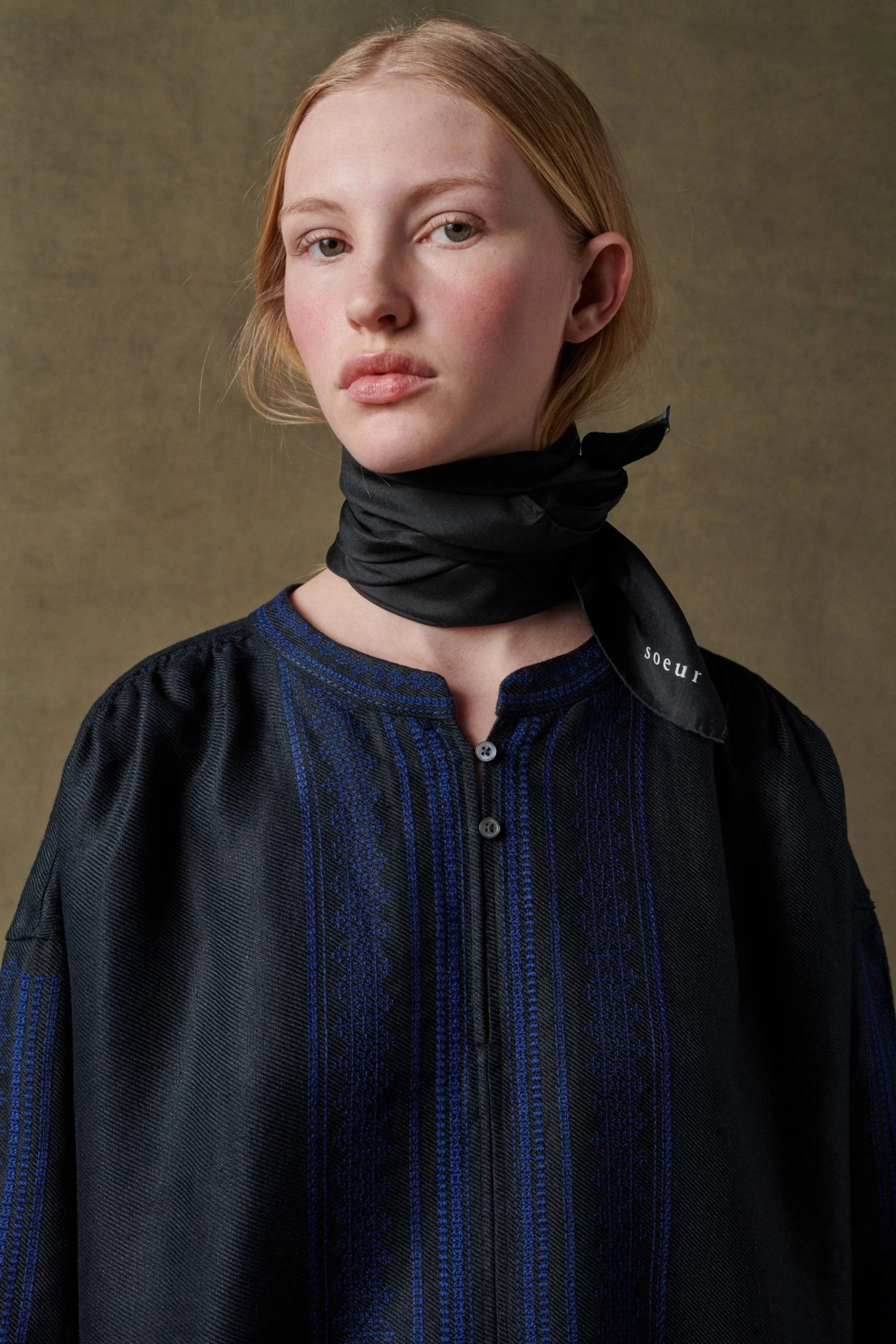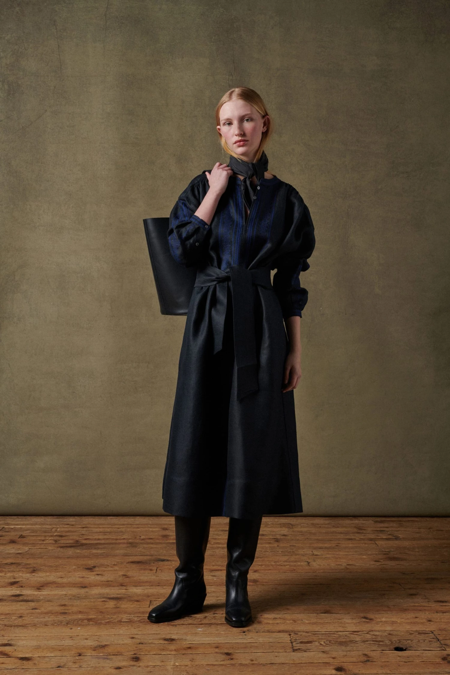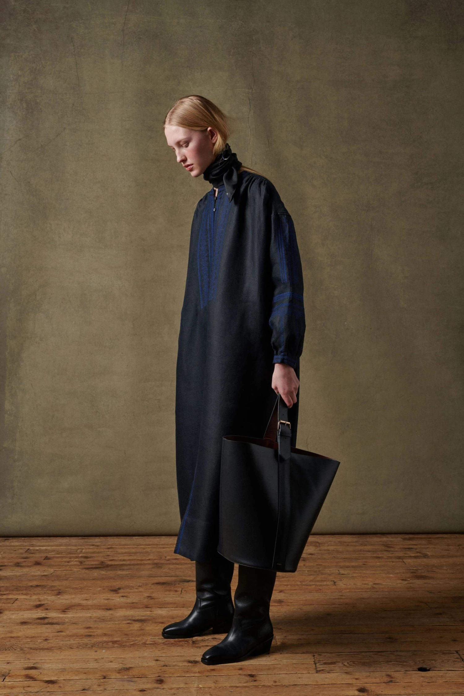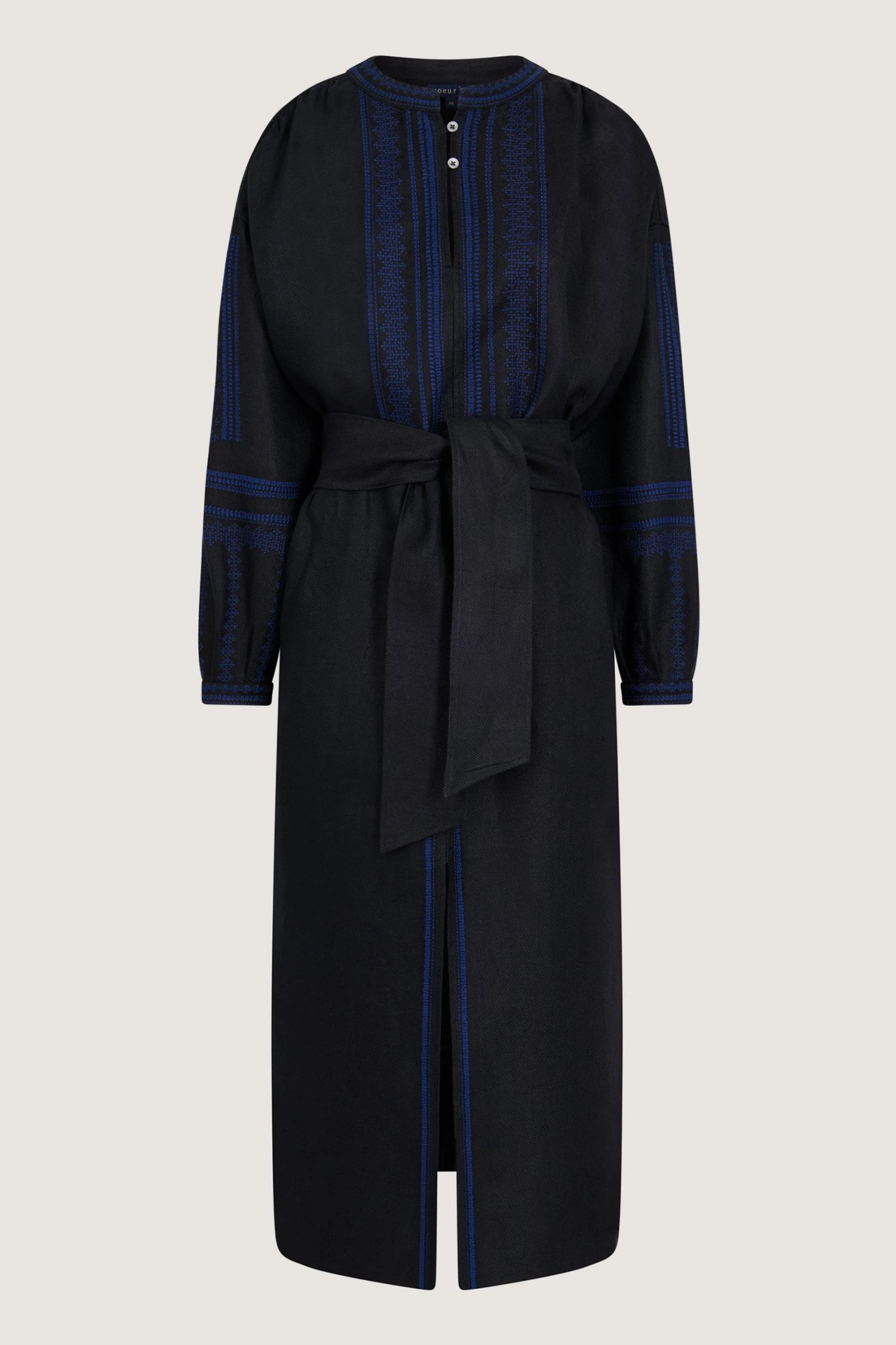 Robe noire en twill lin chintz brodée bleue