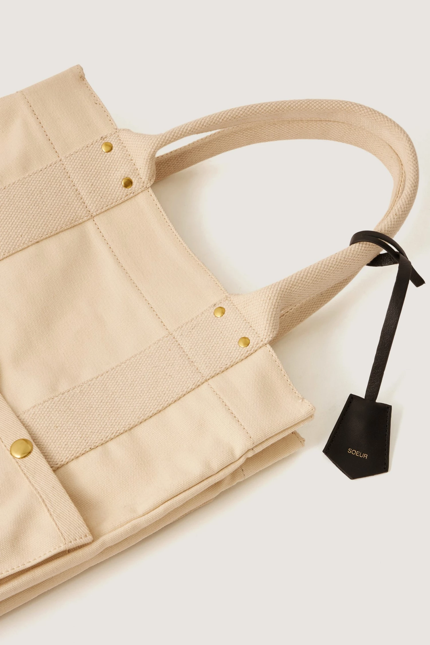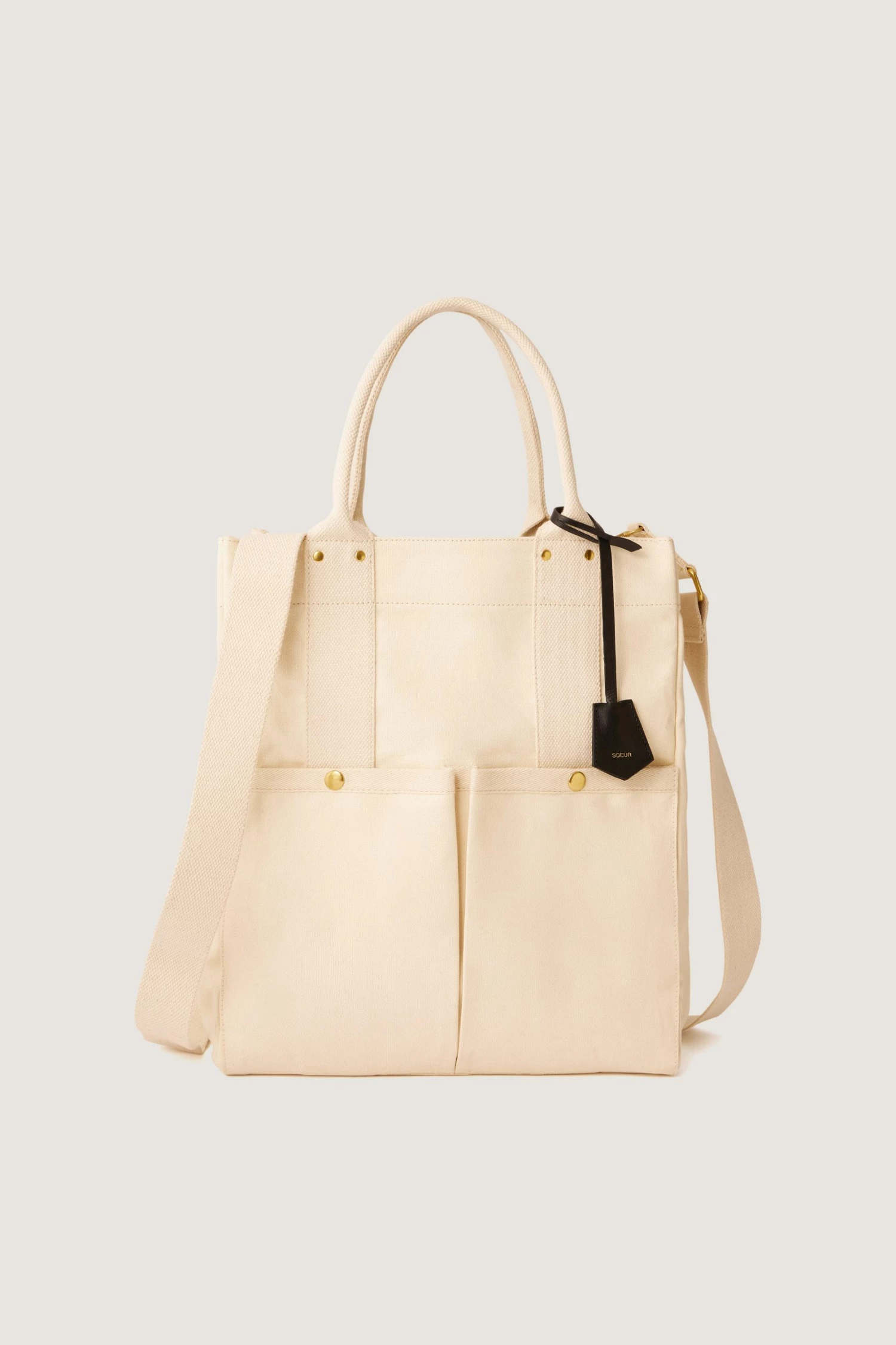 Safari est un sac cabas multipoches en toile pratique et élégant. Sa forme verticale permet de faciliter l’organisation du sac et pouvoir y mettre un ordinateur. Il se porte à la main avec les anses en coton ou en bandoulière grâce à la sangle.
